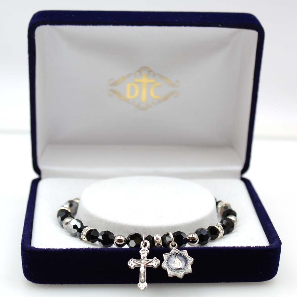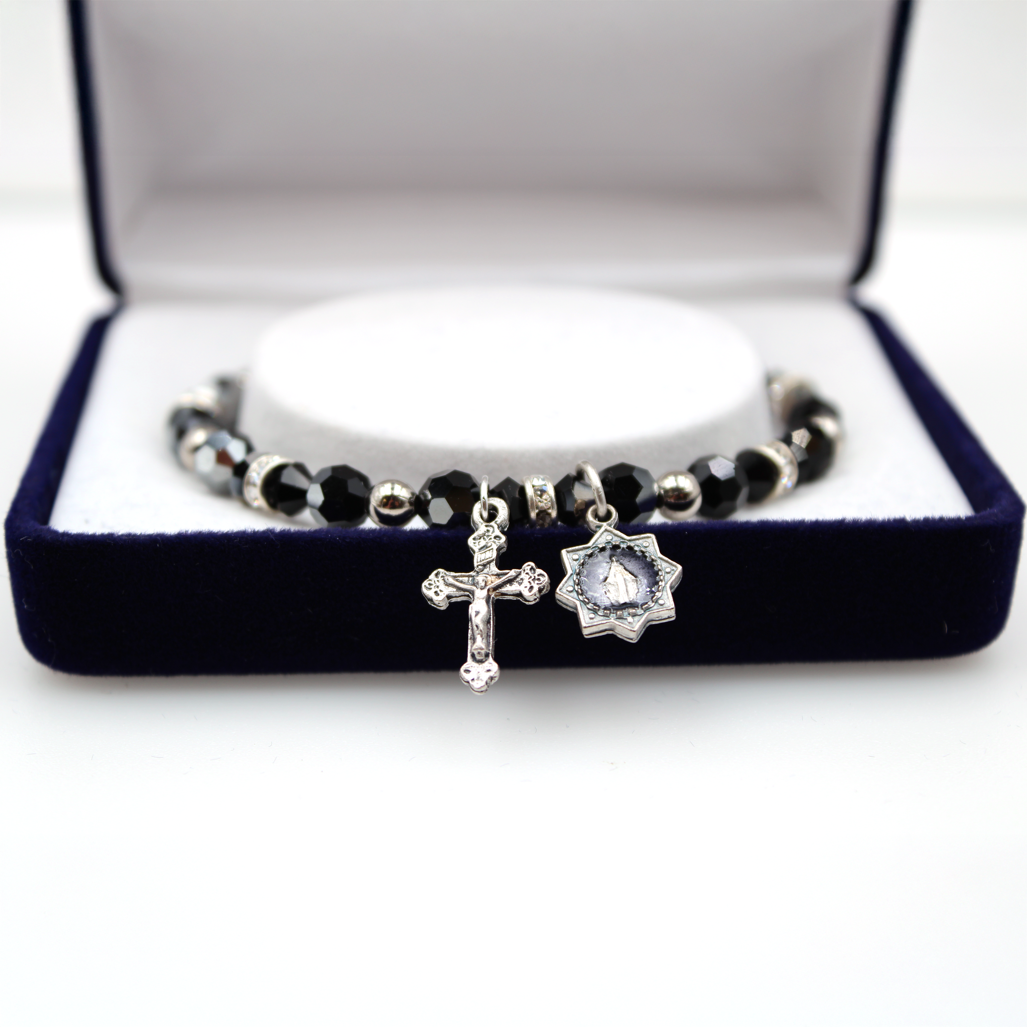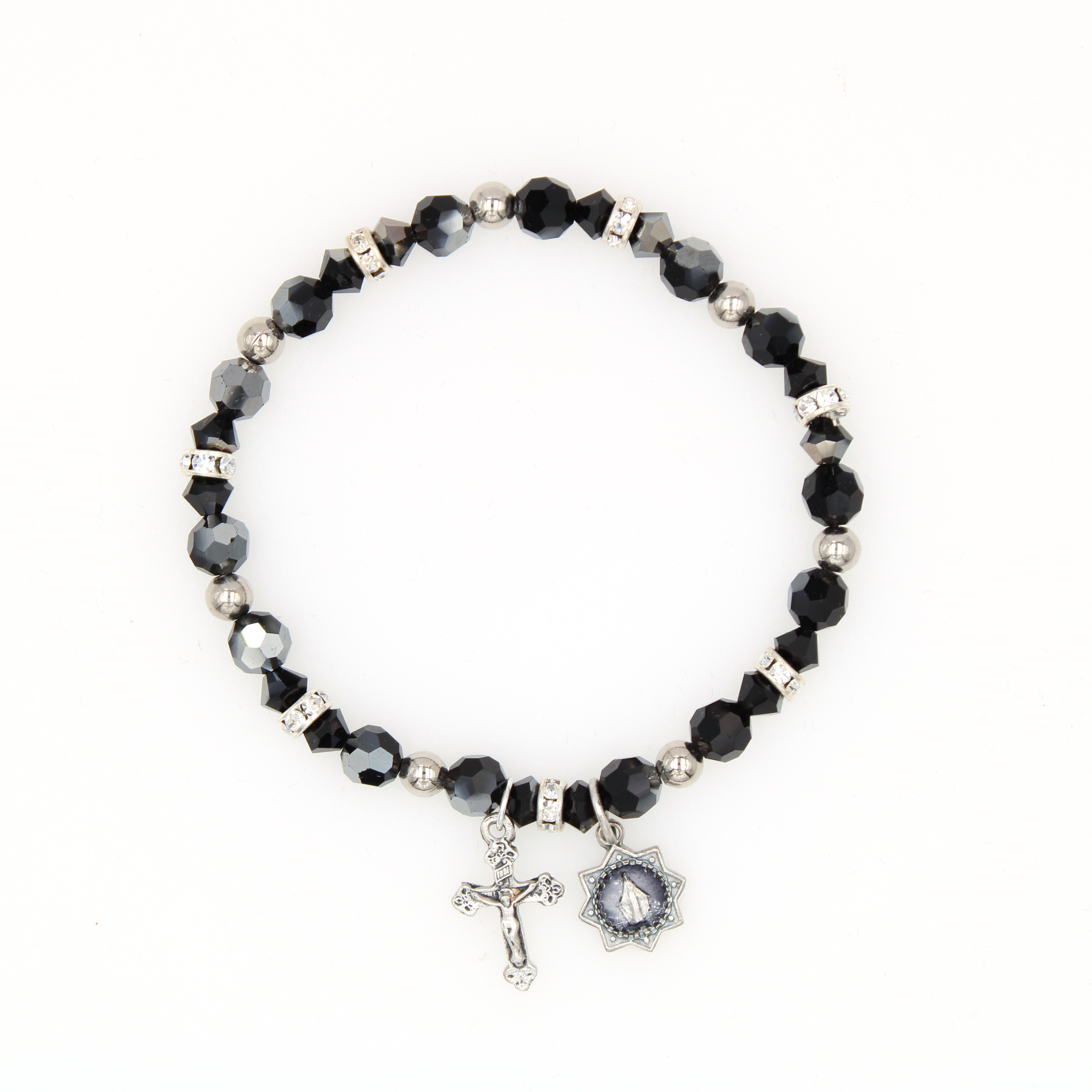 Black Plastic Crystal Bead Bracelet with crucifix and enameled miraculous medal. - 995068/55/BK