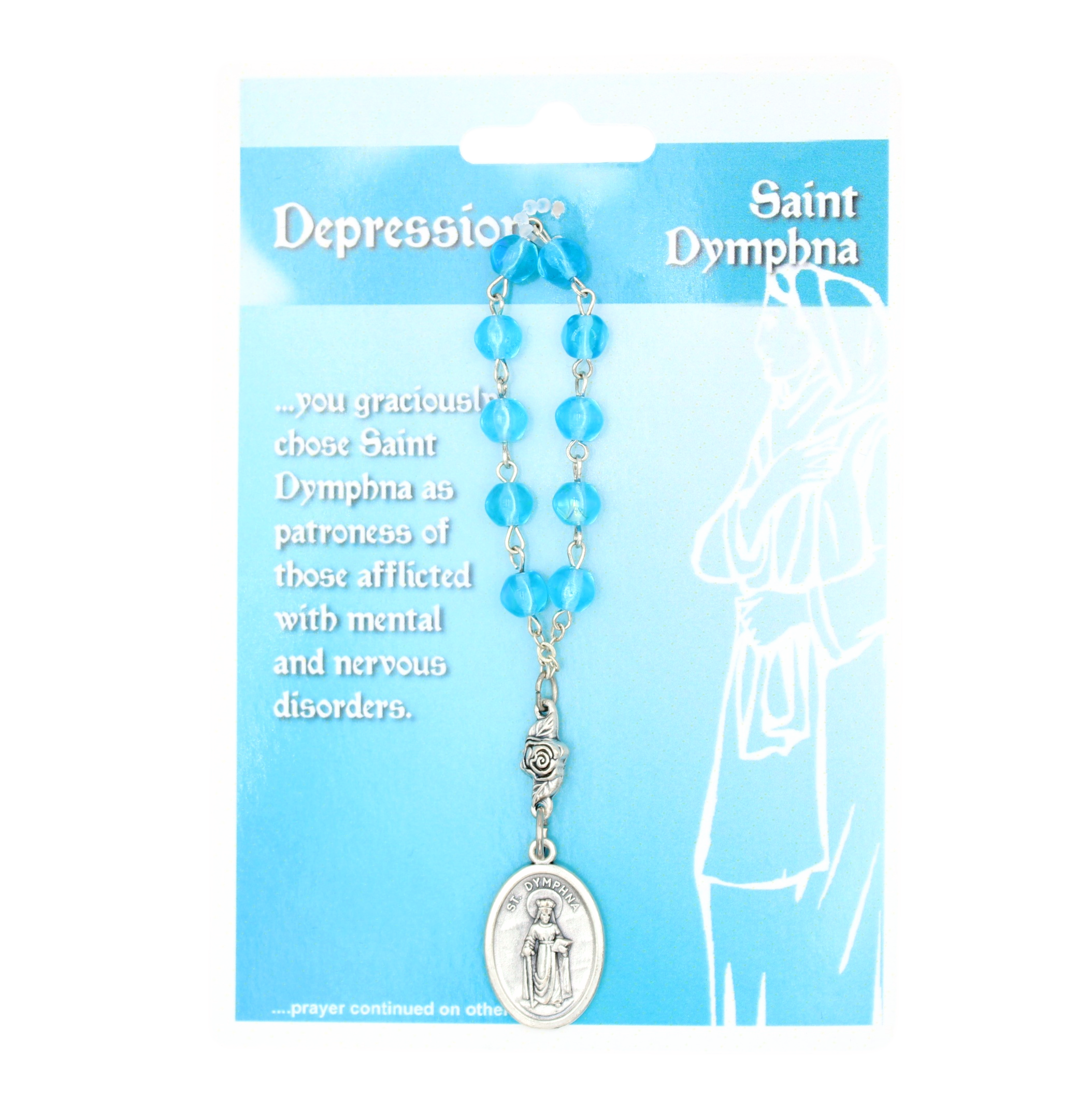 One decade crystal rosary with St. Dymphna medal, the patron saint of Depression. Carded with directions and prayers on the back .