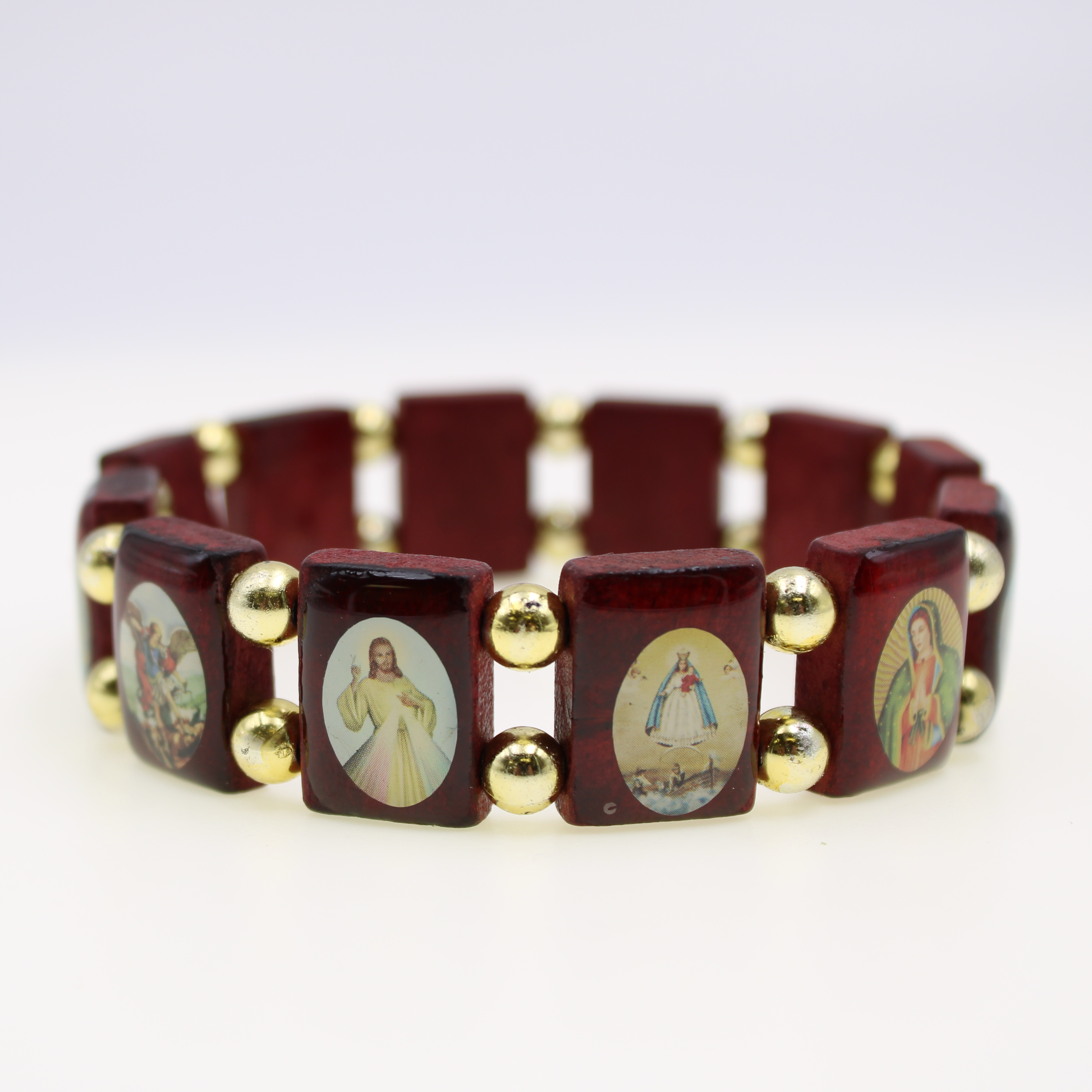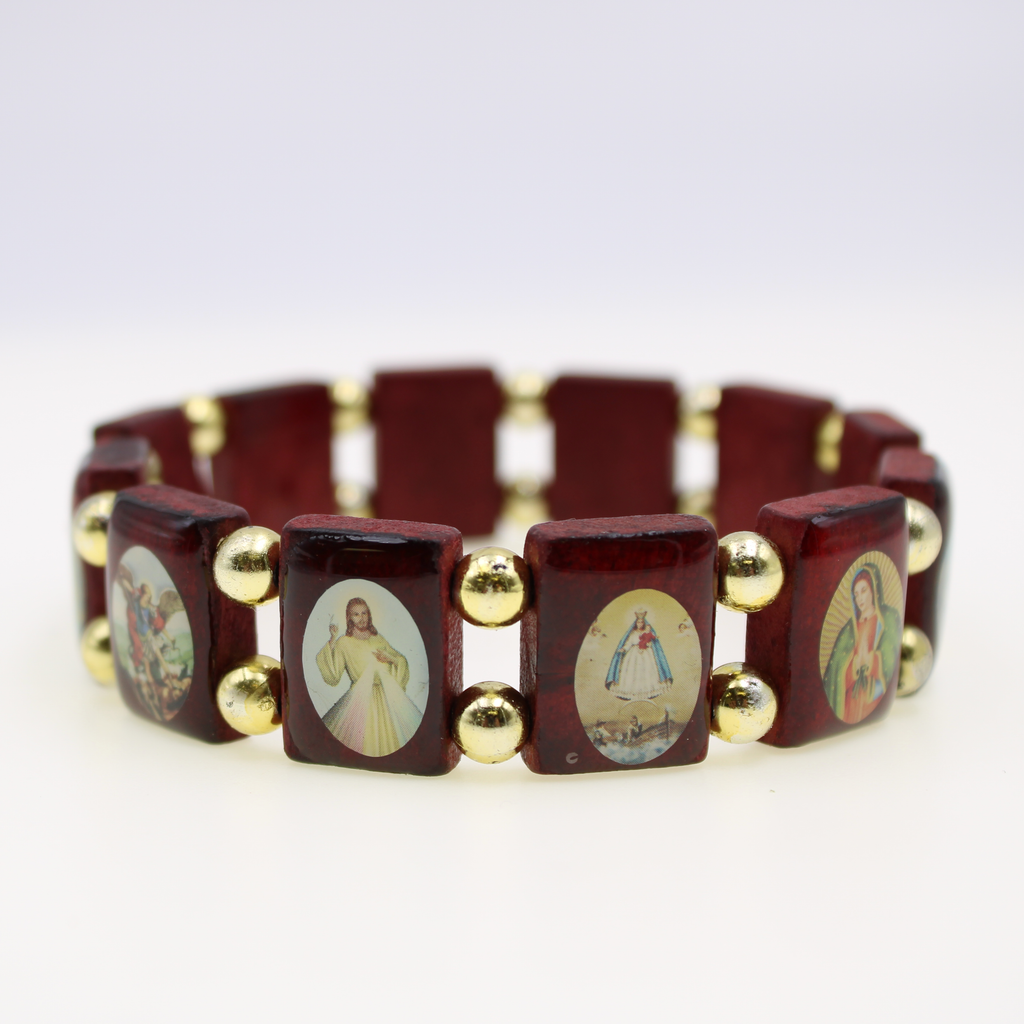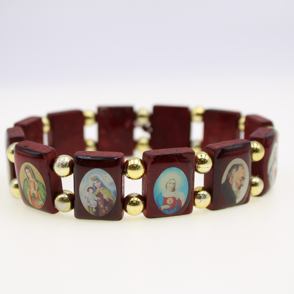 This beautiful dark wood bracelet has 12 beads adorned with a Saint on each, with gold tone spacer beads. Includes a small portrait of Our Lady of Grace, The Divino Niño, Our Lady of Lourdes, St. Jude, St. Michael, The Divine Mercy, Lady of Caridad del Cobre/Our Lady of Charity, Our Lady of Guadalupe, Immaculate Heart of Mary, Padre Pio, Sacred Heart of Jesus.