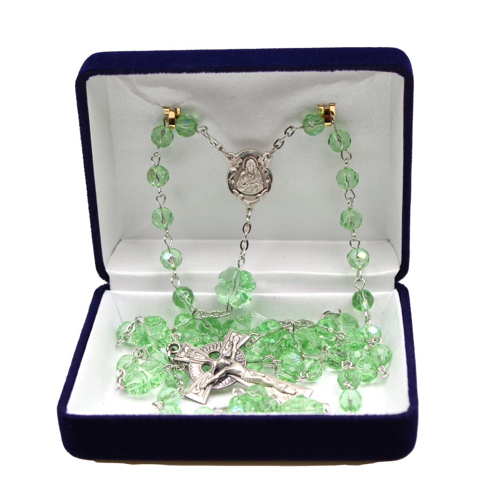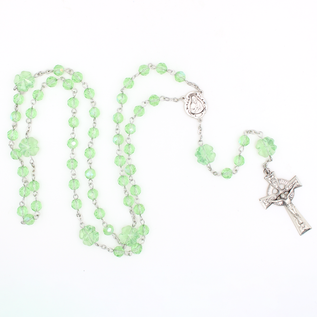 Peridot Rosary with Sterling Crucifix and Center and Clover/Shamrock OF Beads - 304/55/CEL/PD