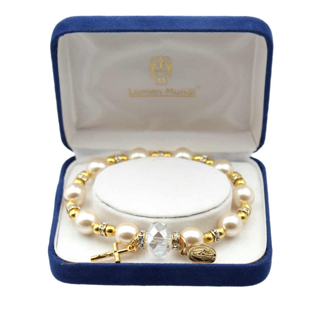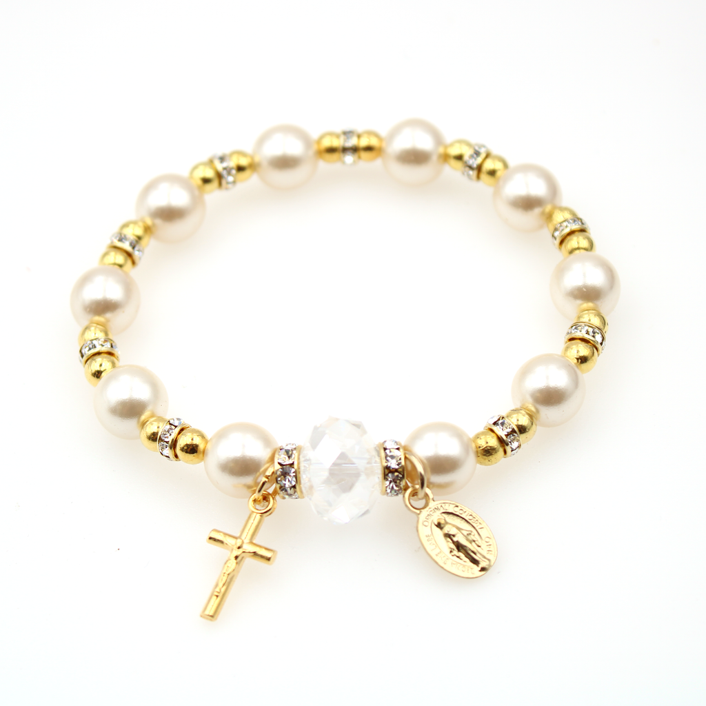 Gold Tone Faux Pearl AND Crystal Bracelet with Miraculous Medal and Crucifix - 5202/55/G/ROSB