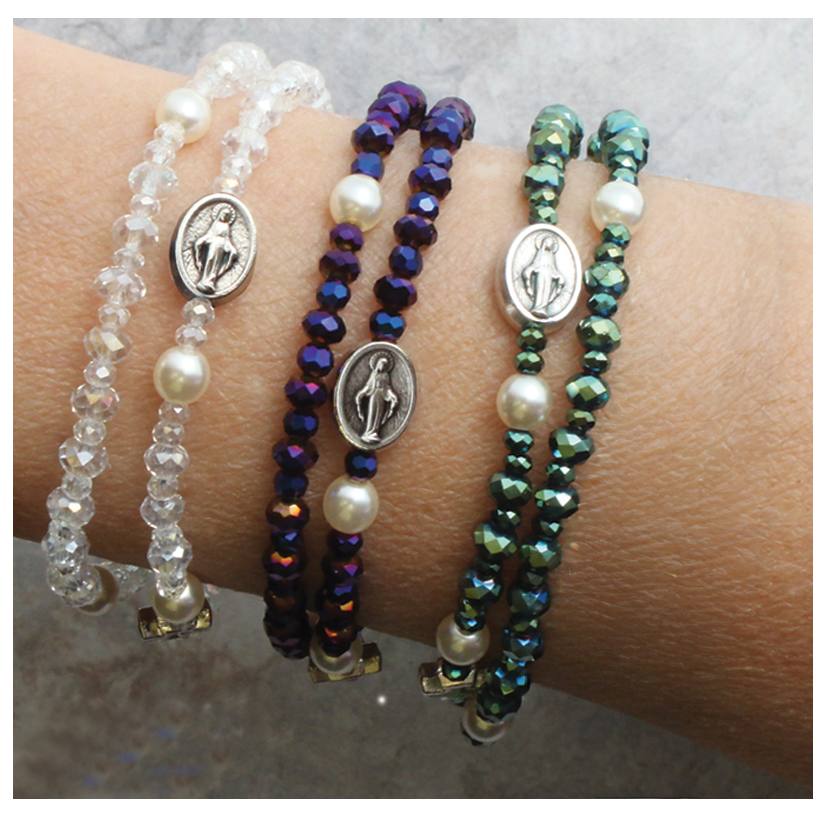 The “Twist of Faith” rosary bracelet series. Each bracelet is made with 4mm crystal shadow beads and is a complete rosary with cross and Miraculous medal. Elasticized so each bracelet can be wrapped around the wrist.