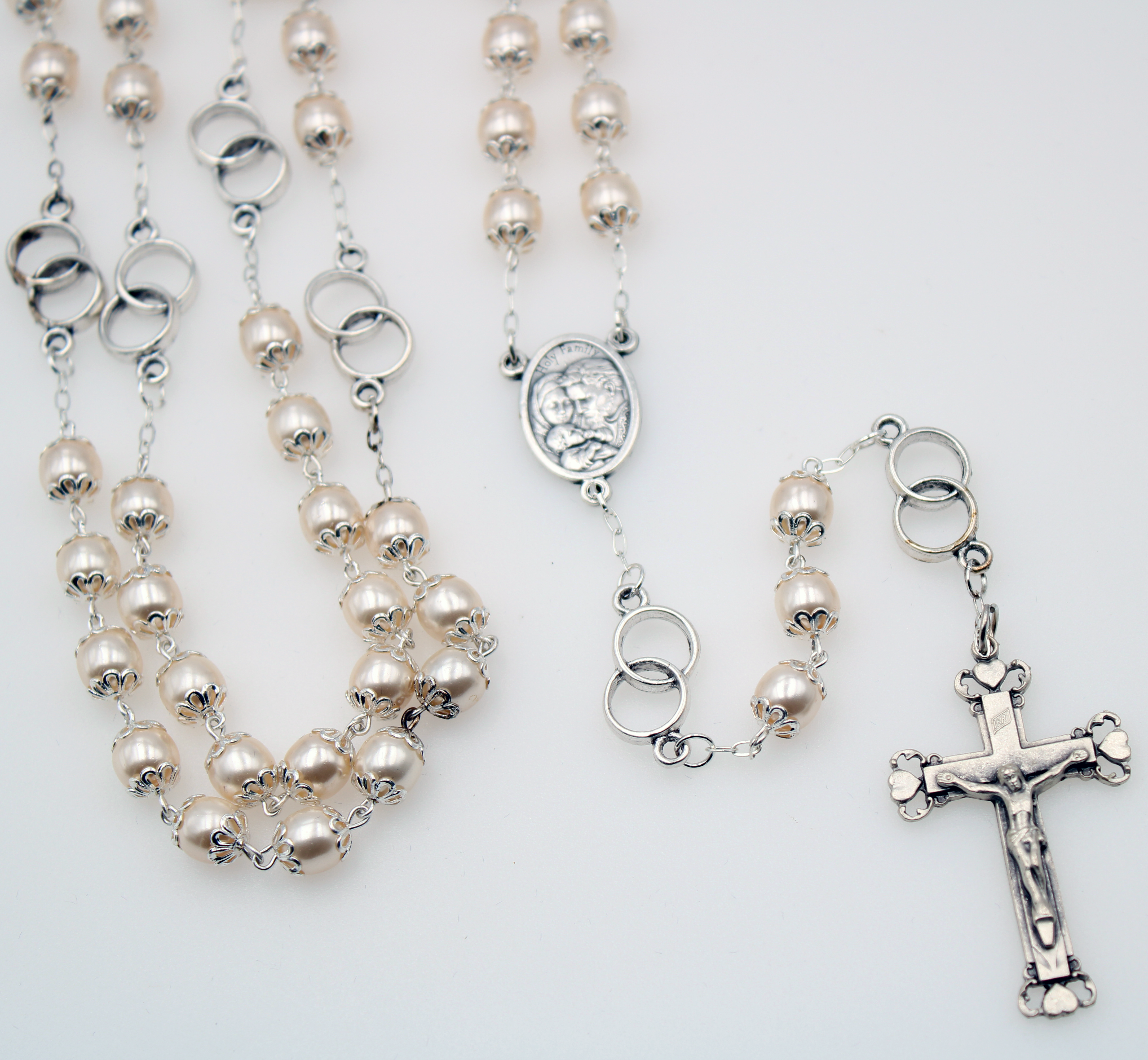 A meaningful gift for the Sacrament of Matrimony, this rosary is designed especially for a bride beginning married life in faith. Each rosary is crafted with luminous pearl beads, featuring elegant wedding ring decade beads as a symbol of unity and lifelong commitment.