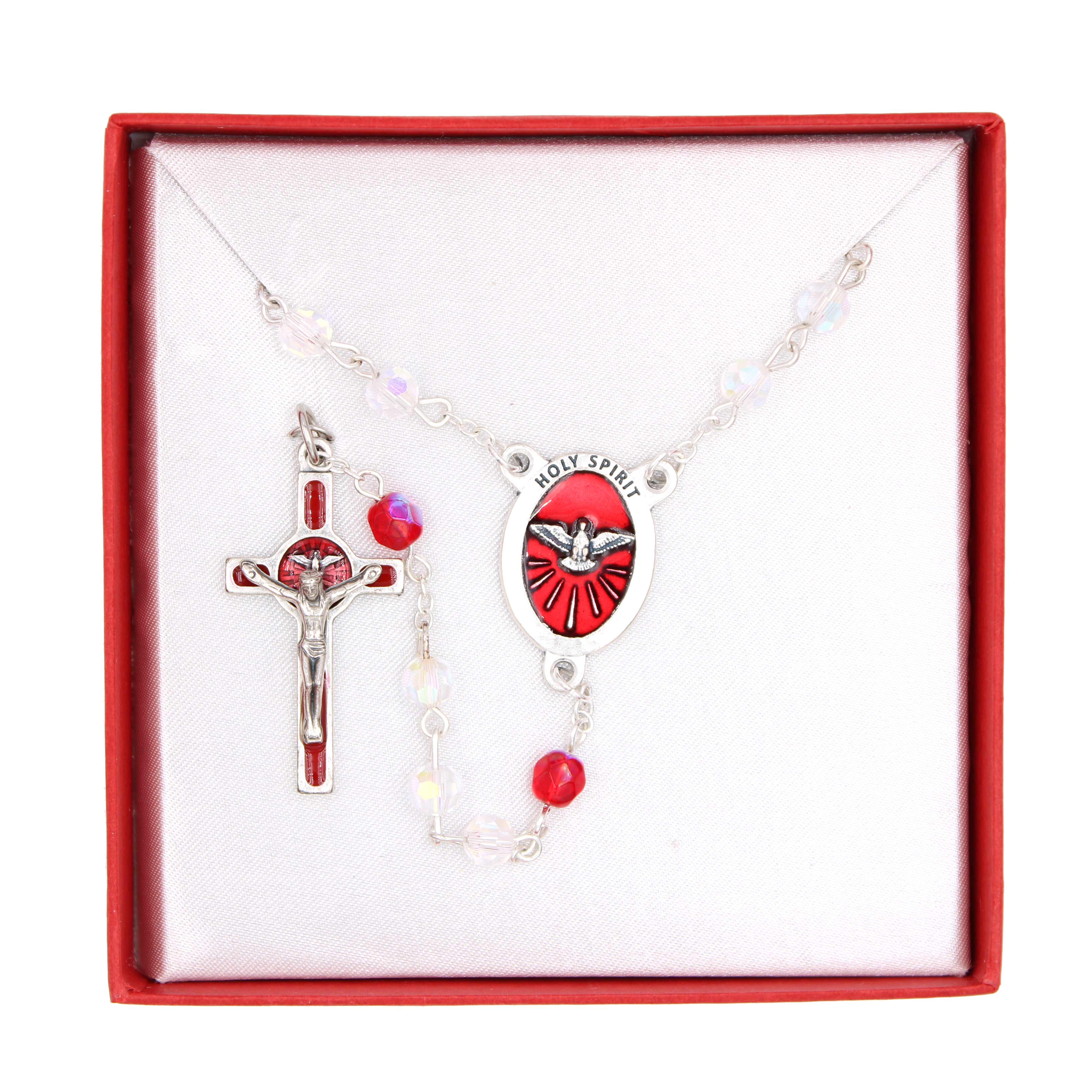 This rosary features 6mm tincut crystals with a shimmering Aurora Borealis finish that catches light beautifully throughout prayer. The 20-inch strand is anchored by an enameled Holy Spirit center and matching crucifix for Confirmation, combining traditional craftsmanship with elegant design. Presented in a white gift box, it's ready for personal devotion or as a meaningful gift for the faithful.
