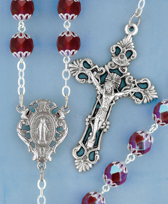 This beautifully crafted 22-inch rosary features 7mm firepolished crystal beads that shimmer with AB (Aurora Borealis) sparkle for a luminous effect. Each bead is linked by durable locklink chains, ensuring lasting strength and integrity. The centerpiece and crucifix are hand engraved, reflecting detailed artistry and devotion. Presented in a gift box, this rosary combines spiritual significance with exquisitely crafted materials, making it a meaningful keepsake or a cherished gift for any occasion.
